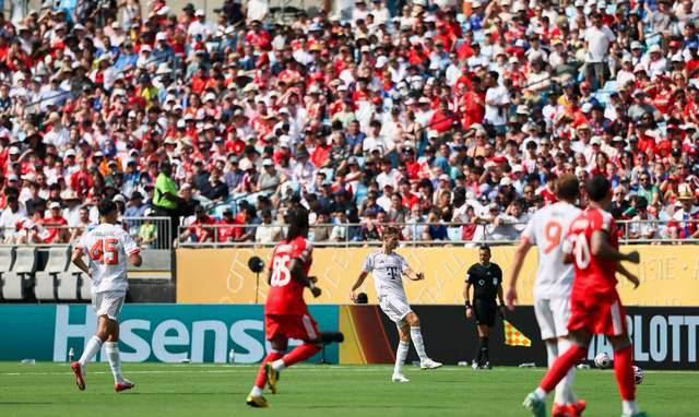 下半场开始时,拜仁慕尼黑队迎来主力替补,希望能扳回比分甚至逆转战局。他们控制了下半场节奏,对本菲卡形成围攻。然而,萨内错失良机,莱默尔射中立柱,基米希的进球亦被VAR取消。最终,拜仁慕尼黑以0-1不敌本菲卡。这场比赛吸引了超过74000名观众到场观看,显示了世俱杯比赛的巨大吸引力,尤其是涉及欧洲豪门和梅西等明星球员的比赛。